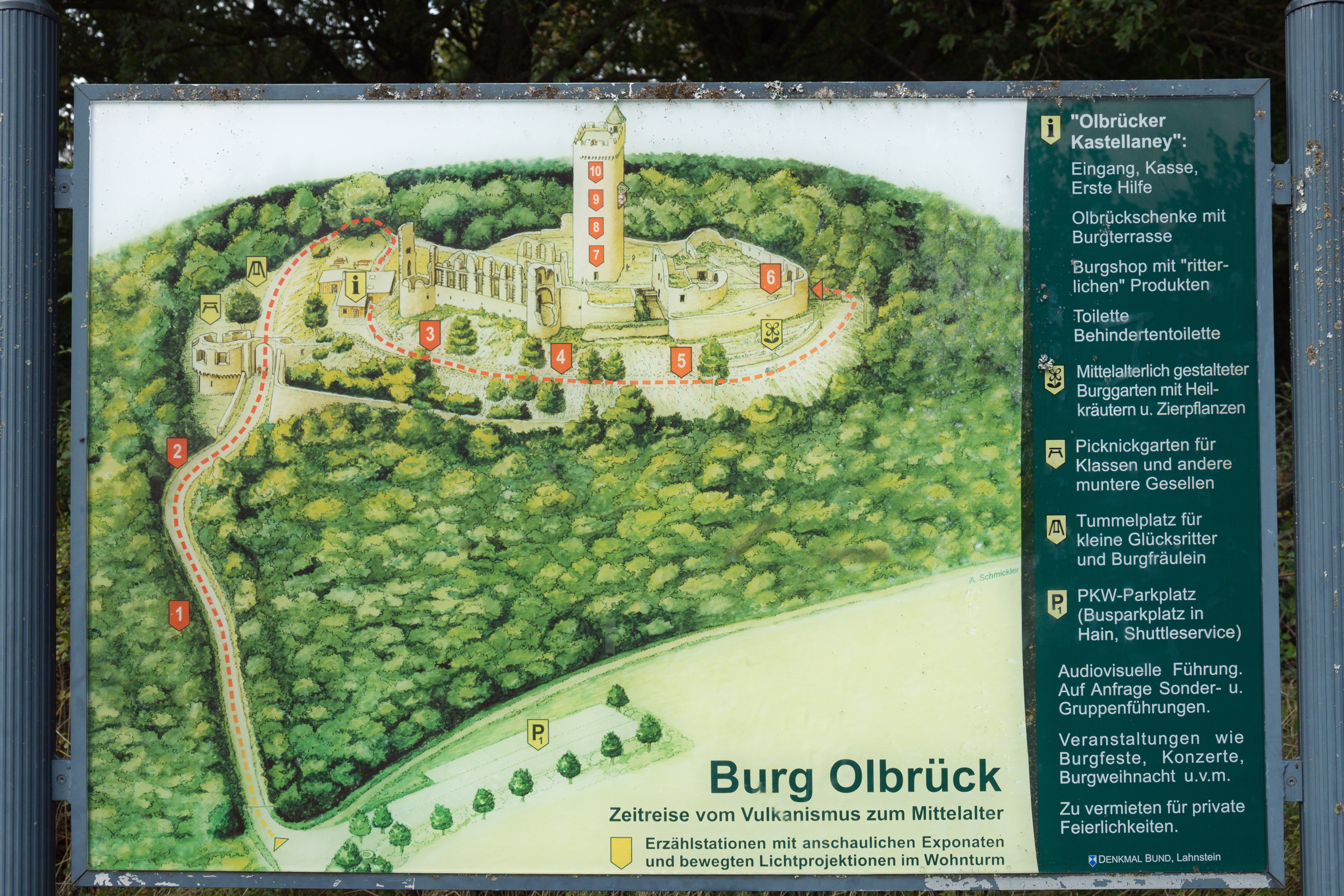 Eine Schautafel am Anfang der Wegstrecke zur Burgruine zeigt in einem grafischen Überblick, was den Besucher erwartet.