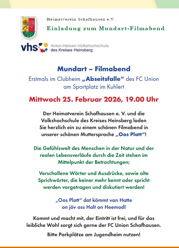 Aktuell laden der Heimatverein Schafhausen e.V. und die VHS des Kreises Heinsberg im Rahmen ihrer Programmgestaltung zu einem neuen Bildungs-und Mitmach-Format ein, dem Mundart – Filmabend!